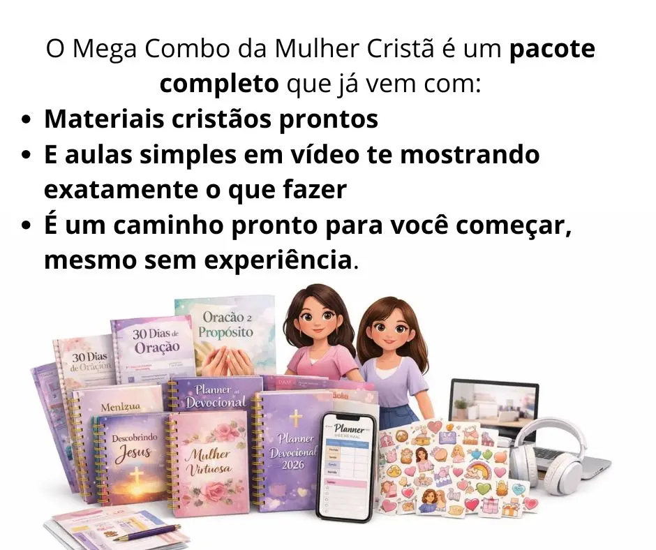 Com o Mega Combo da Mulher Cristã, você recebe produtos prontos + aulas que te mostram exatamente o que fazer.